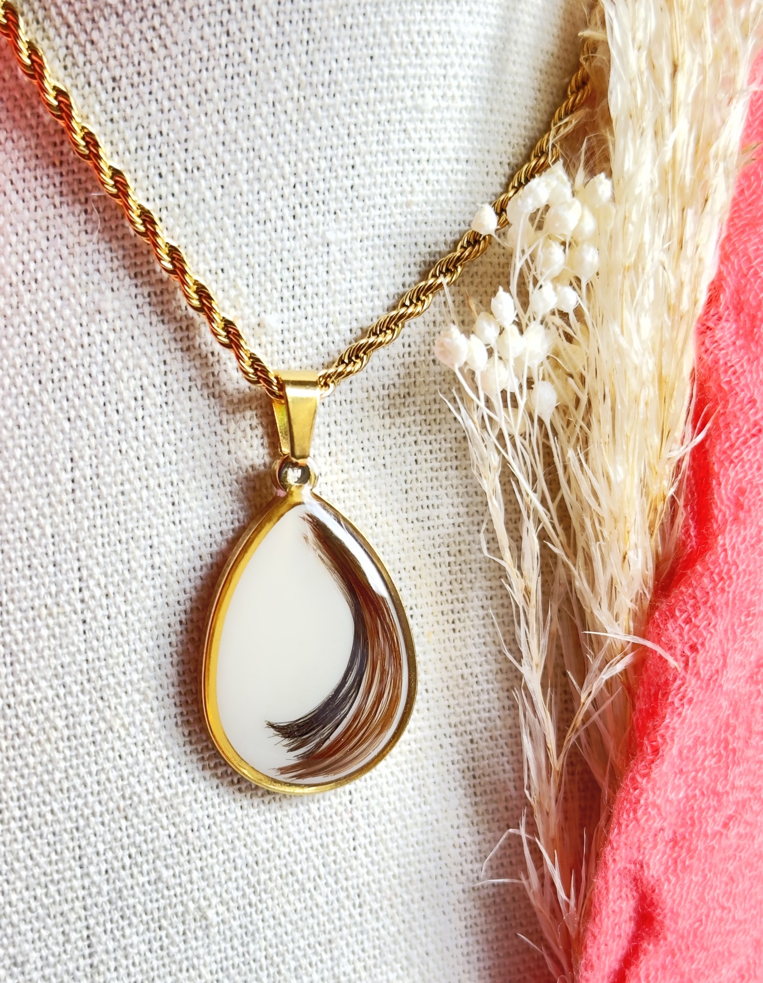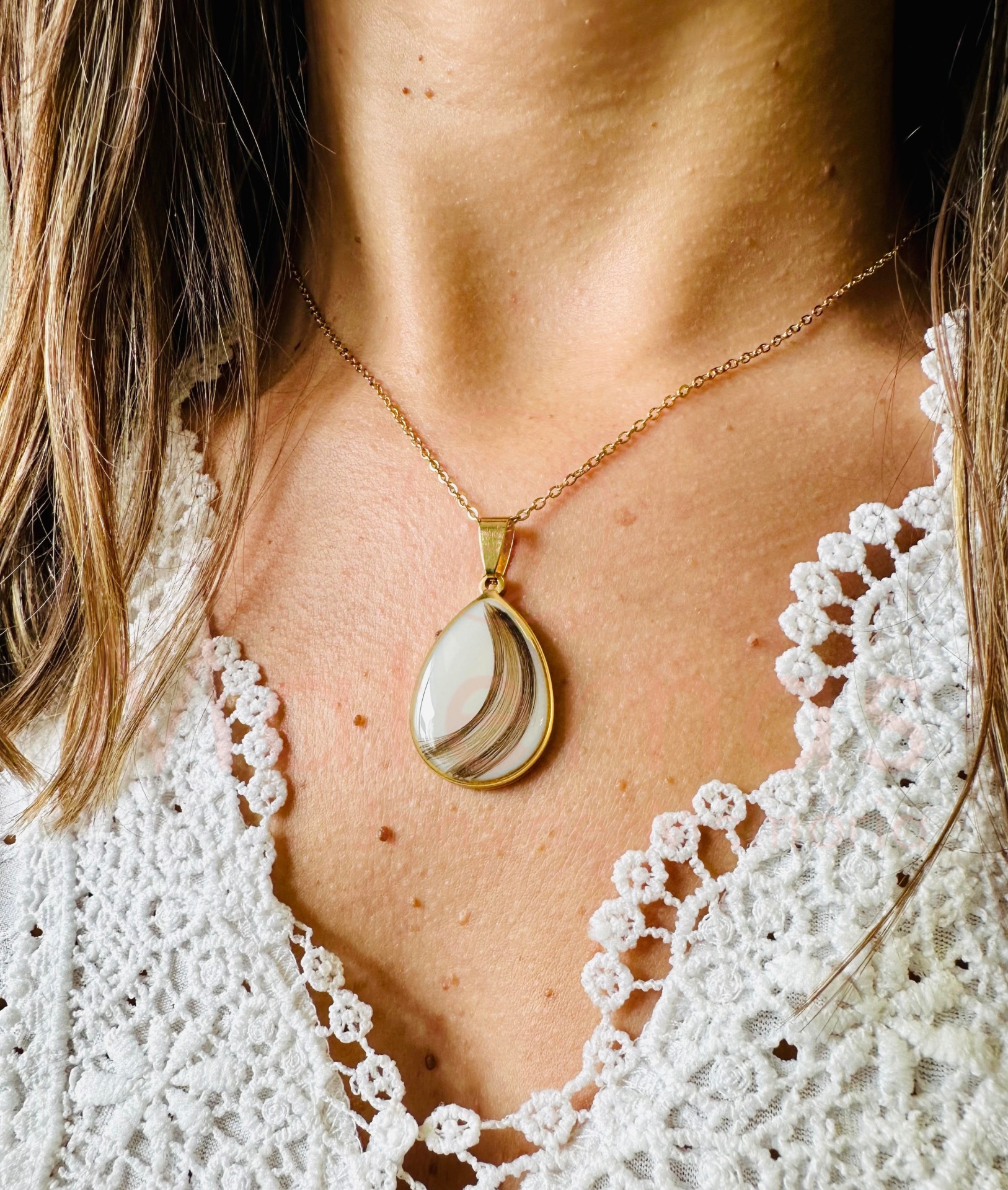 Pendente em forma de Gota, com eternização de cabelinhos de mais do que um membro da Família.