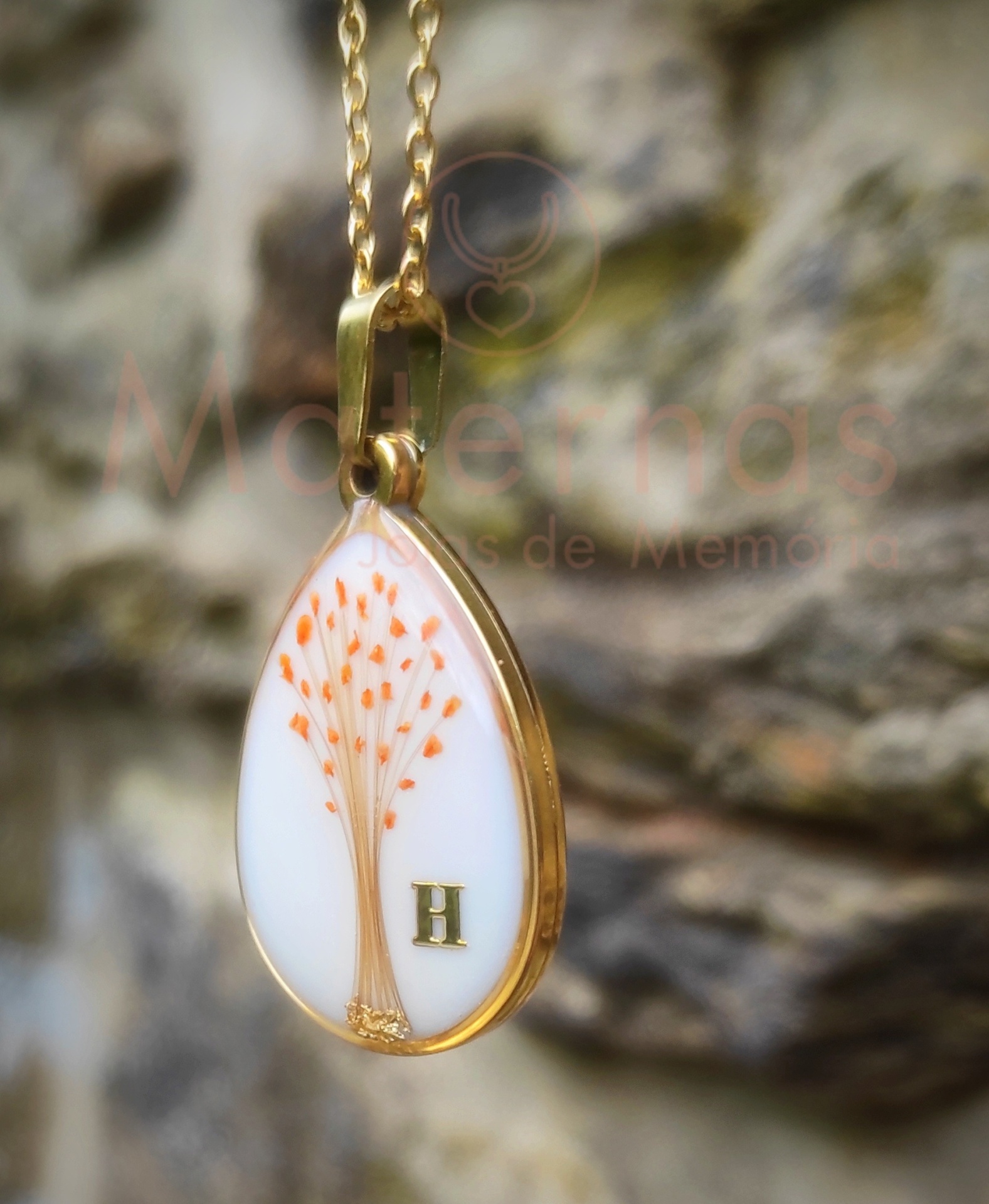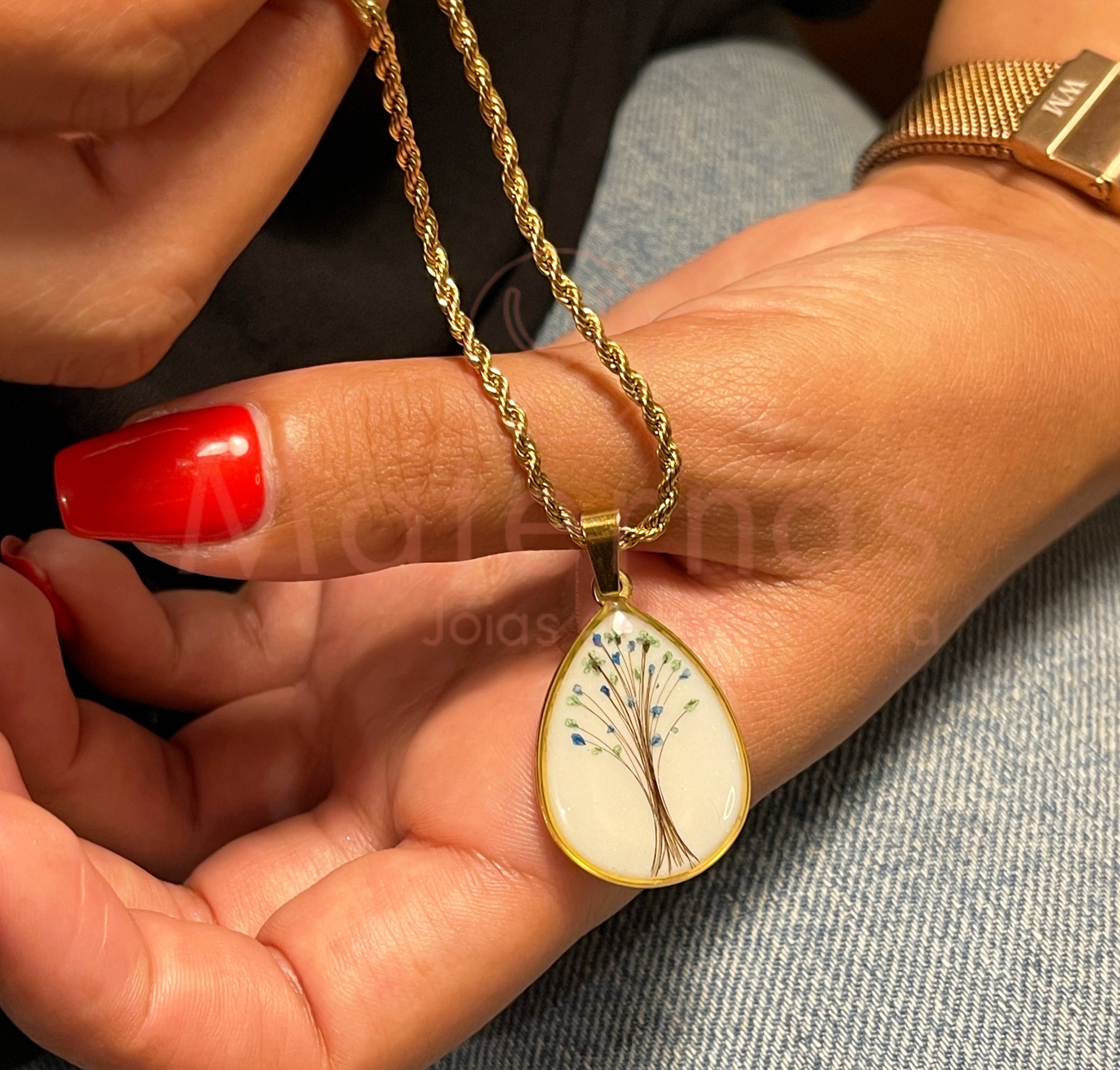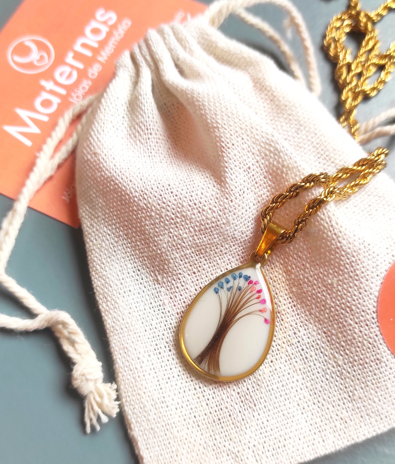 Pendente em forma de Gota, com eternização de cabelinho, trabalhado, em forma de Árvore.