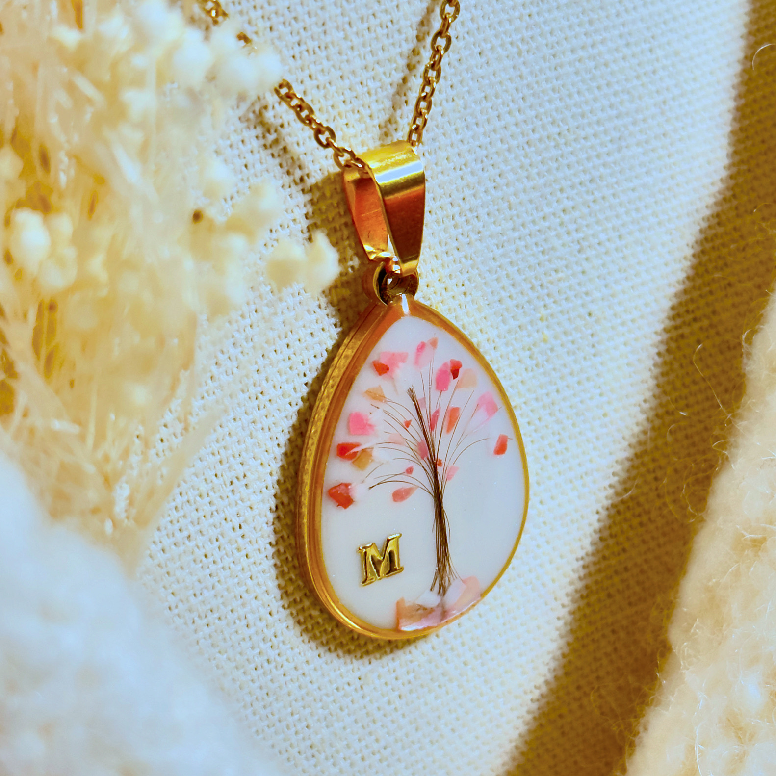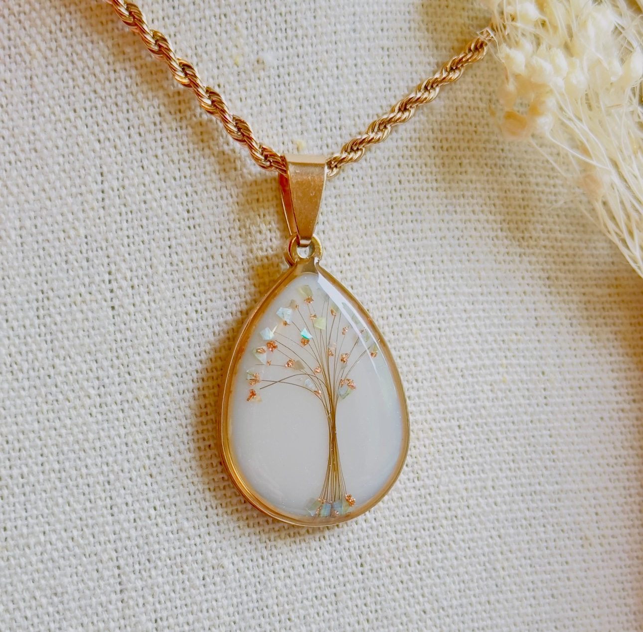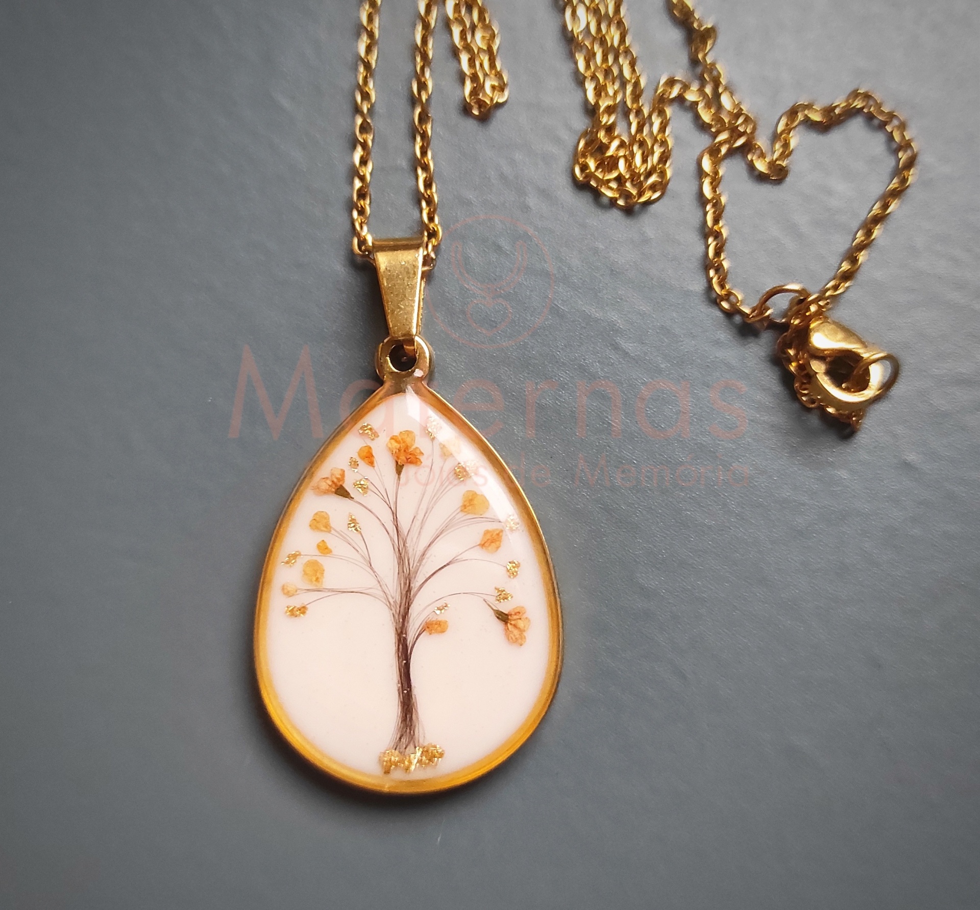 Pendente em forma de Gota, com eternização de cabelinho, trabalhado, em forma de Árvore.