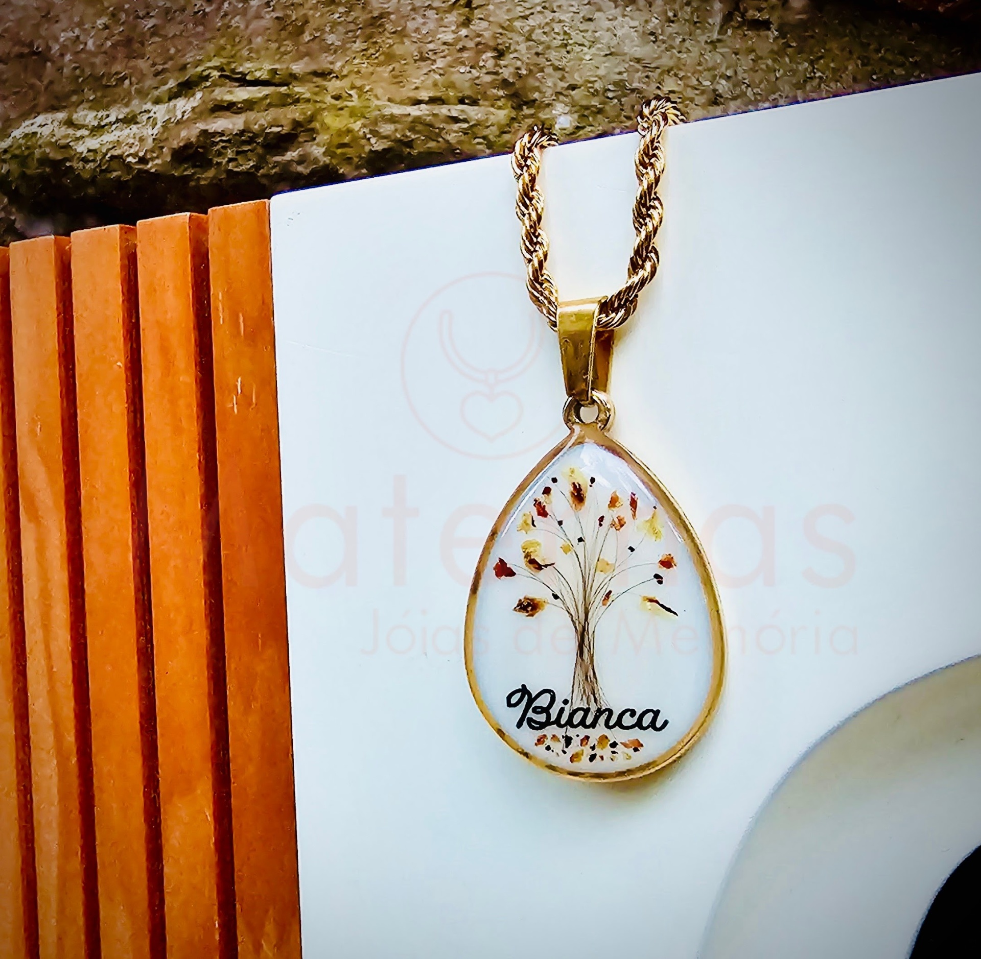 Pendente em forma de Gota, com eternização de cabelinho, trabalhado, em forma de Árvore e com nome.